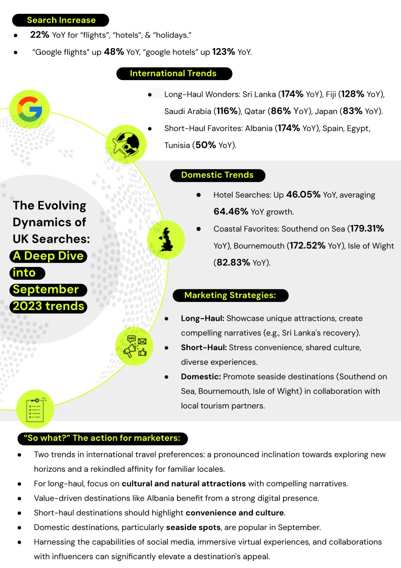 The travel search trends of September 2023 reflected, at a micro level, the macro global dynamics which UK consumers are having to consider when making their purchase choices. Diving deep into this data not only paints a clear picture of shifting preferences but also paves the way for marketers to align their strategies with the pulse of the modern UK traveller.